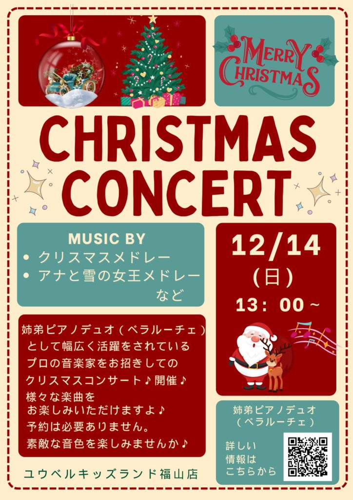 本日はキッズランド福山店から少し早い【Xmasコンサート】開催のお知らせです☆